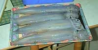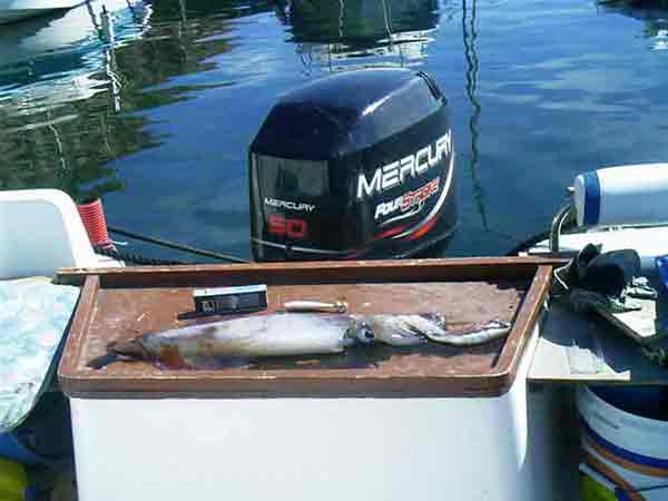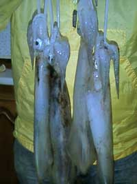 tendremos que cambia el bajo. Hay quien pesca los calamares con caña de carrete, y si bien con este sistema evitamos los desagradables líos, no estamos muy a favor del mismo ya que se reduce notablemente la sensibilidad tan importante para esta pesca, y a veces perdemos mas piezas que las que sacamos. Es recomendable tener listo otro aparejo completo de pesca, ya montado, ya que casi siempre los líos vienen a darse justo en el momento de mayor intensidad de la pesca, por lo que no debemos entretenernos en desliar el enredo, dejándolo para desliarlo en casa, por lo que como decimos debemos de desechar rápidamente el aparejo liado y coger el de repuesto, con lo que la pérdida de tiempo será mínima. Previsiones como ésta nos ayudarán a pescar más. Sobre las poteras y los pajaritos debemos llevarnos por nuestra experiencia o por la de los pescadores mas experimentados a la hora de escoger el color y el modelo, que deberá adecuarse siempre a las circunstancias de la mar, preferencia según las determinadas épocas, etc. En todo caso recomendamos los pajaritos de doble corona de alfileres por ser mas efectivos. Es muy recomendable mantener una exquisita limpieza sobre poteras y pajaritos, evitando su contacto con tabaco, combustible u otros olores fuertes, toda vez que los calamares poseen un olfato finísimo. MANERA DE PESCARLOS Buscaremos la zona de pesca más idónea. No es difícil de enterarse y si no simplemente sabiendo mas o menos el lugar nos acercaremos (sin molestar) a las embarcaciones que lo estén pescando y nos pondremos a su lado. Comenzaremos haciéndolo a mayor profundidad si vamos de tarde y a menor si lo hacemos de alba. Nos dejaremos llevar por la corriente y luego regresaremos de nuevo al principio poniéndonos con algún metro de diferencia para así rastrear una zona mas amplia, a medida que se va haciendo de noche nos acercaremos a tierra. Si es de alba será al revés. En el momento de obtener un claro síntoma de estar en buen lugar nos marcaremos de inmediato para poder volver al mismo lugar. Si llevamos GPS marcaremos ese sitio para retornar al mismo. Como norma general, sin que sea un dogma, diremos que con aguas claras y tranquilas probaremos a mayor profundidad. En caso contrario buscaremos menor fondo. Como decíamos al principio, partimos con la ventaja de que es un animal muy glotón, por lo que siempre está dispuesto a comer, para ello hay que incitarle mediante movimientos de nuestro aparejo. Una vez desplegado hasta el fondo el arte comenzaremos a subirlo parando cada dos o tres brazas, lo mantendremos quieto durante unos segundos dando unos tirones de vez en cuando con el brazo para ver si enganchamos, y a continuación subiremos otras tantas brazas hasta llegar mas o menos a medias aguas momento en el que bajaremos de nuevo el arte al fondo y volver a empezar. Si hay mucha corriente sacaremos por completo el mismo y lo volveremos a echar para evitar que vaya muy tendido Esta pesca es cuestión como decimos de una buena sensibilidad para ello se debe de estar con el dedo índice y el brazo extendidos atentos a cualquier señal que nos pueda venir del otro extremo del sedal. Su picada no es tan brusca y cierta como la de otra clase de pez, es como si de pronto se nos enganchara una bolsa de plástico, notando un aumento de tensión en nuestra línea, a lo cual debemos responder con un tirón suficiente como para que quede bien clavado en los alfileres de nuestra potera-pajarito, subiendo seguidamente muy despacio de forma continuada y sin hacer pausas. NO PRECIPITARSE ¡MANTENER LA CALMA¡ el calamar sólo se nos irá si lo tratamos bruscamente o si no seguimos un ritmo de recuperación continuo y adecuado a la pieza que cobramos. Es posible que el calamar que se ha enganchado sea de gran tamaño (superior a los 500 grs), entonces sus primeros intentos por soltarse serán los mas peligrosos. En el momento en que notemos que hay una buena pieza al otro lado del sedal adecuaremos su subida a la resistencia que nos oponga, a veces es recomendable parar la subida (sin llegar a destensar el hilo). A cada tirón que nos dé el mismo nosotros responderemos estirando nuestro brazo para contrarrestarlo, pudiéndose llegar incluso a soltar línea cuando se trata de grandes ejemplares, pero sin llegar como decimos a destensar el hilo, pues en ese momento podría soltarse. Al llegar a la superficie le sacaremos la cabeza del agua para que expulse la misma intentando que no nos bañe de agua y tinta. Una vez que expulse el agua lo sacaremos inmediatamente, sin dejarle que vuelva a coger nueva remesa de agua. Si por cuestión de la corriente el calamar se viene a la superficie y expulsa el agua, ya no le daremos tregua y lo acercaremos rápidamente al barco para evitar que pueda obtener mas líquido con el que hacer fuerza. Una vez calibrado el bicho deberemos sopesar la conveniencia de usar salabre o gancho de tres anzuelos para sacarlo del agua y asegurarnos su captura. En las embarcaciones de bajo francobordo lo agarraremos con la mano entre el tubo y la cabeza. Otra forma de pescarlo es al curri, teniendo el inconveniente de que hay que hacerlo por la noche, y que sólo lo podremos pescar las noches de luna llena. Navegaremos a velocidad mínima de aproximadamente dos nudos, y lanzaremos unos cuarenta metros de línea, con terminal de 0,25 a 0,40, poniendo al final un señuelo idóneo. La distancia deberá ser cercana a la costa y a una profundidad recomendable de unos 5 o 6 metros. Sobre